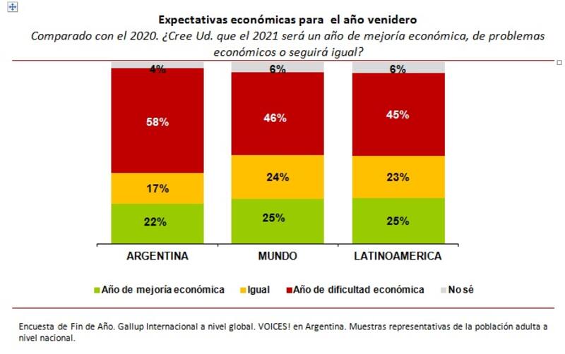 Seis de cada diez argentinos, es decir el 58%, aguarda un año de problemas económicos y sólo 2 de cada 10, el 22%, espera un año de mejoría económica, dice el informe sobre los resultados de la "44ª Encuesta anual de fin de año de Gallup Internacional y Voices! en Argentina". El mismo relevamiento determina que otro 17% manifiesta que el 2021 será un año igual al año que pasó y un 4% no sabe.