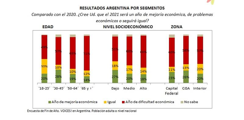 El pesimismo económico de la Argentina aumenta conforme sube la edad de los consultados. El 71% de los mayores de 65 años dice que el 2021 será un año de problemas económicos contra 49% entre los más jóvenes. También crece la visión más crítica a mayor poder adquisitivo: 66% en los estratos altos son pesimista contra el 51% en los estratos medios. "No obstante en todos los segmentos sociodemográficos la mayor parte de los encuestados espera un año de problemas económicos", señala el informe.