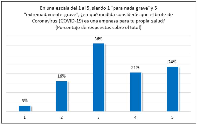 Pero en cuanto al impacto que pueda generar sobre sí mismos, el 36% de los encuestados consideró la pandemia como un riesgo moderado, mientras que el 24% lo percibe como una amenaza 'extremadamente grave'; un 21%, una amenaza 'grave'; un 16%, un riesgo leve, y un 3%, 'nada grave'.