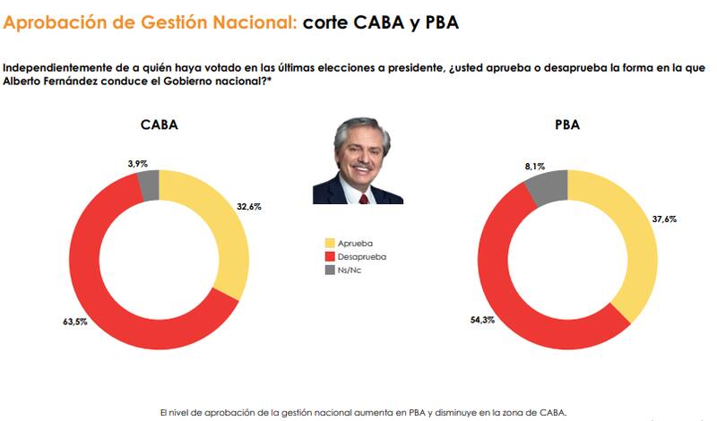 En este sentido, ese mismo estudio arroja que el nivel de aprobación de la gestión nacional aumenta en la provincia de Buenos Aires mientras que disminuye en la Ciudad Autónoma de Buenos Aires.