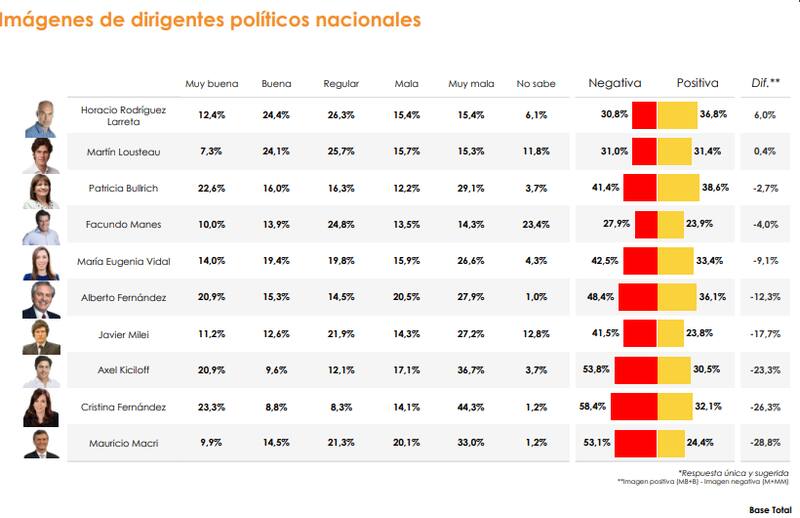 En tanto, el segundo lugar lo ocupa Rodríguez Larreta con 36,8% de imagen positiva y una imagen negativa del 30,8%. En tanto, el tercer puesto es para el Presidente, con el 36,1% de imagen positiva y un 48,4% de imagen negativa.