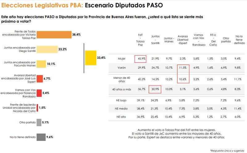 En tanto, Juntos por el Cambio se ubicaría en segundo puesto. Si se suman las listas que encabezan el radical Facundo Manes y Diego Santilli, quedarían a cinco puntos por debajo del oficialismo, que lleva a Victoria Tolosa Paz como primera candidata.