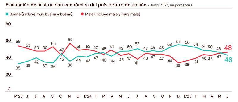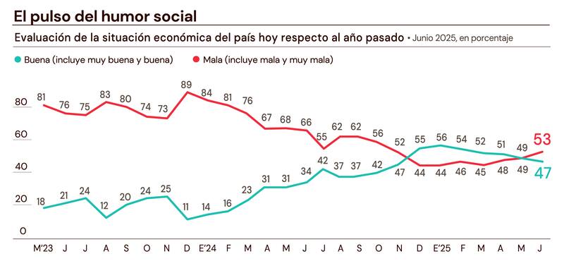 Algo similar ocurre con la perspectiva sobre lo que ocurrirá dentro de un año, ya que alcanzó un mayoritario 48% de proyecciones negativas, el peor registro desde abril de 2024, aunque solo 19% entre los oficialistas y 84% entre opositores.