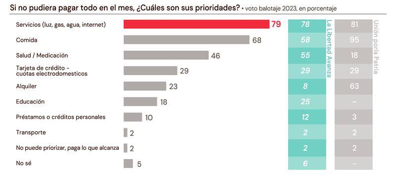 Por ello, aplican su propio ajuste y seleccionan qué priorizar a la hora del gasto si los ingresos no alcanzan para cubrir todos los pagos. La mayoría ubica primero en la lista a los servicios como la luz, el agua, el gas e internet; seguido de la comida, la salud, la tarjeta de crédito y el alquiler.