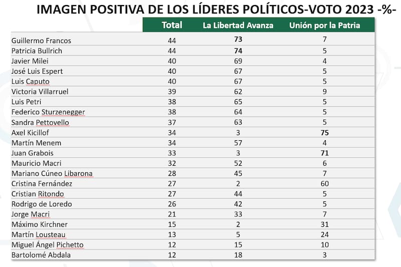 En el electorado de Unión por la Patria, Axel Kicillof se mantiene como la figura con mayor respaldo, con un 75% de imagen positiva y 34% a nivel general; mientras que Cristina Kirchner solo suma 60% entre los votantes de UxP en 2023 y 27% en el total. Al respecto, el consultor indicó la ex presidenta "mantiene un perfil relativamente bajo de adhesión, no habiéndose modificado sensiblemente por el hecho de su prisión, ni entre propios ni entre opositores".