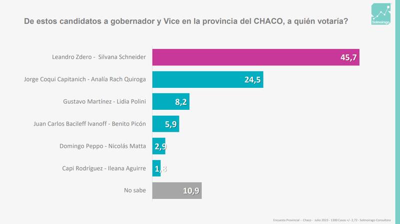 La provincia de Chaco elegirá gobernador el próximo 17 de septiembre y unaencuesta publicada por la consultora Solmoirago reveló que Juntos por el Cambio, con su candidato Leandro Zdero, mantiene la intención de voto más competitiva de entre todas las fuerzas, con más de 21 puntos de ventaja respecto al actual mandatario Jorge Capitanich.