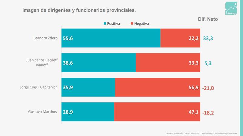 Otra señal negativa que marca el informe es que entre los encuestados que todavía no definieron el sentido de su voto, un 31,5% "jamás votaría" a Jorge Capitanich, mientras que un 18,5% le corresponde a Leandro Zdero. En cuanto al diferencial neto de imagen -es decir, positiva sobre negativa-, el diputado opositor tiene un saldo de 33,3 puntos, mientras que el cuatro veces gobernador cifra un -21,0 puntos.