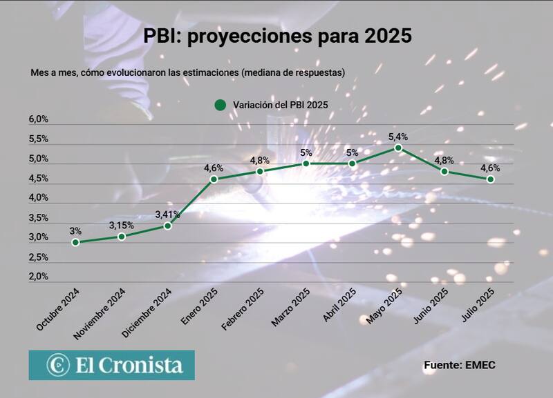 En cuanto al Producto Bruto Interno (PBI), luego de que el mes pasado se rompiera la tendencia, en julio continuo la baja: ahora los privados sostienen que el crecimiento será del 4,6% en 2025, lo que implicó una variación de 0,2 p.p. intermensual.