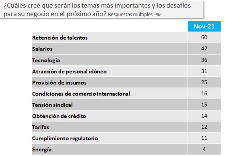 Entre los temas más importantes y los desafíos para sus negocios en el 2022, los empresarios destacaron la retención de talentos, los salarios, la tecnología, la atracción de personal idóneo y la provisión de insumos.