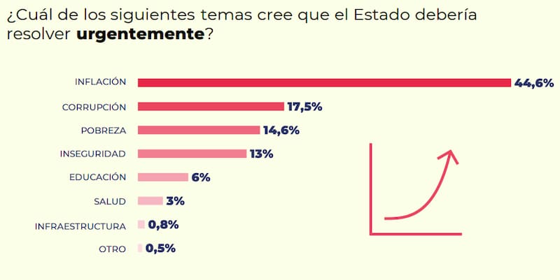 Del total de la población encuestada, el 81,3% piensa que el Estado es incapaz de resolver la inflación. Y el 44,6% cree que es el principal problema por resolver.