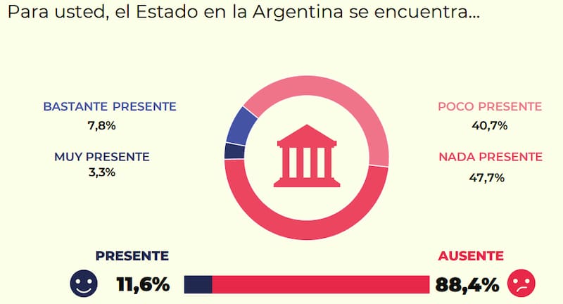 Siempre de acuerdo al estudio elaborado por Espacios Políticos, dos de cada tres personas consideran que el Estado no desempeña correctamente su función en ningún área. Estos datos se ven plasmados en la percepción negativa que tiene la población sobre la presencia estatal. Es que, según el informe, el 88,4% siente que el Estado en la Argentina se encuentra ausente.