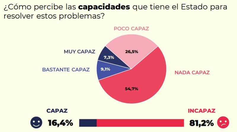 A sí mismo, la encuesta también refleja que la opinión pública considera al Estado como incapaz de resolver esos problemas. A esto se le suma que reina una desconfianza general sobre el accionar del Estado. ¿Los motivos? La falta de transparencia en las decisiones públicas y el desconocimiento sobre la correcta utilización de los recursos demuestran la baja credibilidad que tiene la sociedad frente a las instituciones políticas.