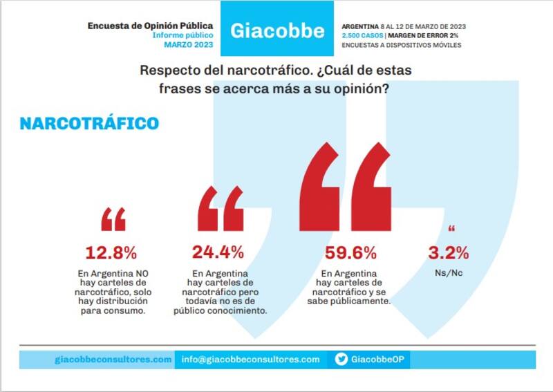 Al comparar el narcotráfico en la provincia santafesina con el resto del país, un 59,6% cree que hay mayor actividad, y un 39,2% opina que es igual. Por otro lado, un 60% reconoció que la situación de los cárteles de droga es de público conocimiento, un 24,4% cree que están en actividad pero que se desconoce dónde y cómo, y un 12,8% opina que sólo hay distribución para el consumo.