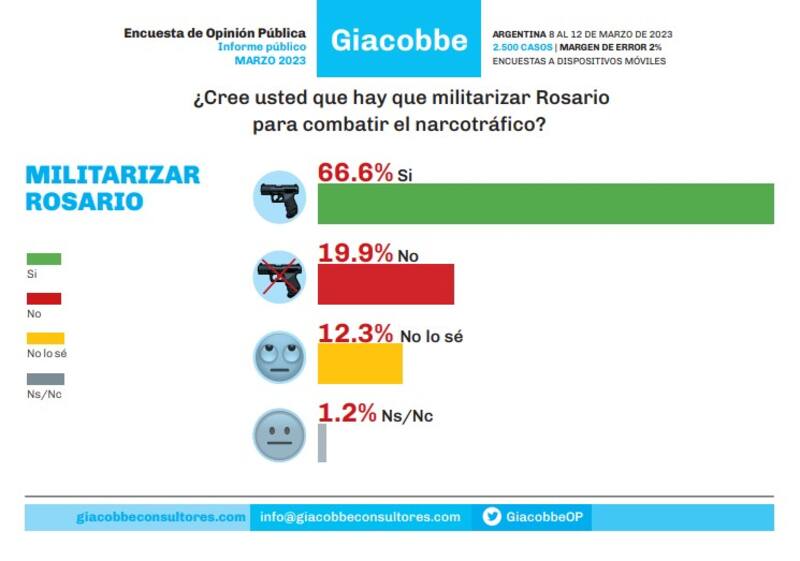 En cuanto a las medidas para combatir la actividad delictiva, un 66,6% de los participantes confirmó que está de acuerdo con que el Ejército acompañe a las fuerzas de seguridad, y casi un 20% se manifestó en contra.