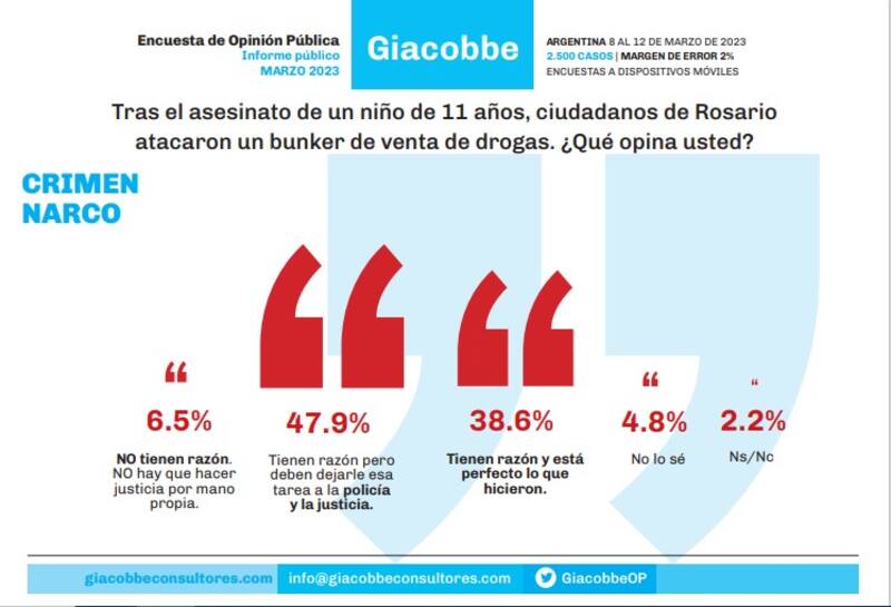 Una encuesta realizada por la consultora Giacobbe & Asociados, de buena sintonía con el bullrichismo, analizó la opinión pública sobre los hechos en la ciudad santafesina. Ante la pregunta de qué opinaban del ataque de los vecinos al bunker que vendía drogas, un 47,9% de los encuestados manifestó que tienen razón pero que la policía tendría que ocuparse de eso, un 38,6% justificó el alzamiento y cree que está perfecto lo que hicieron, y sólo un 6,5% cree que estuvo mal.