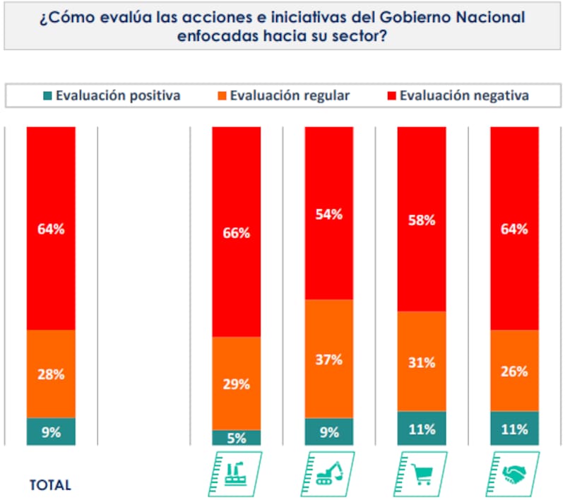 En cuanto a las medidas del Gobierno, el 64% de los empresarios encuestados dio una evaluación negativa, mientras que solamente el 9% mostró su aprobación.