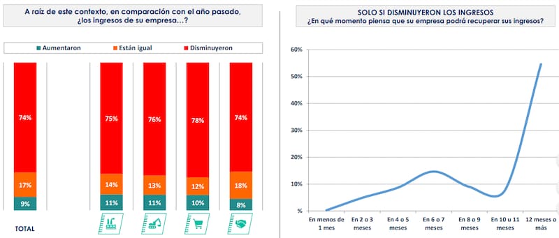 Dado que los datos y respuestas se terminaron de recolectar en julio, el plazo de cierre que se puso el 32% de pymes es octubre, por lo que 40 días más de confinamiento después del 20 de septiembre podría generarle severos complicaciones a este segmento. Si se suma el 23% que en julio aseguró no poder resistir más de un mes, la porción con severo riesgo de cierre asciende a 55%.