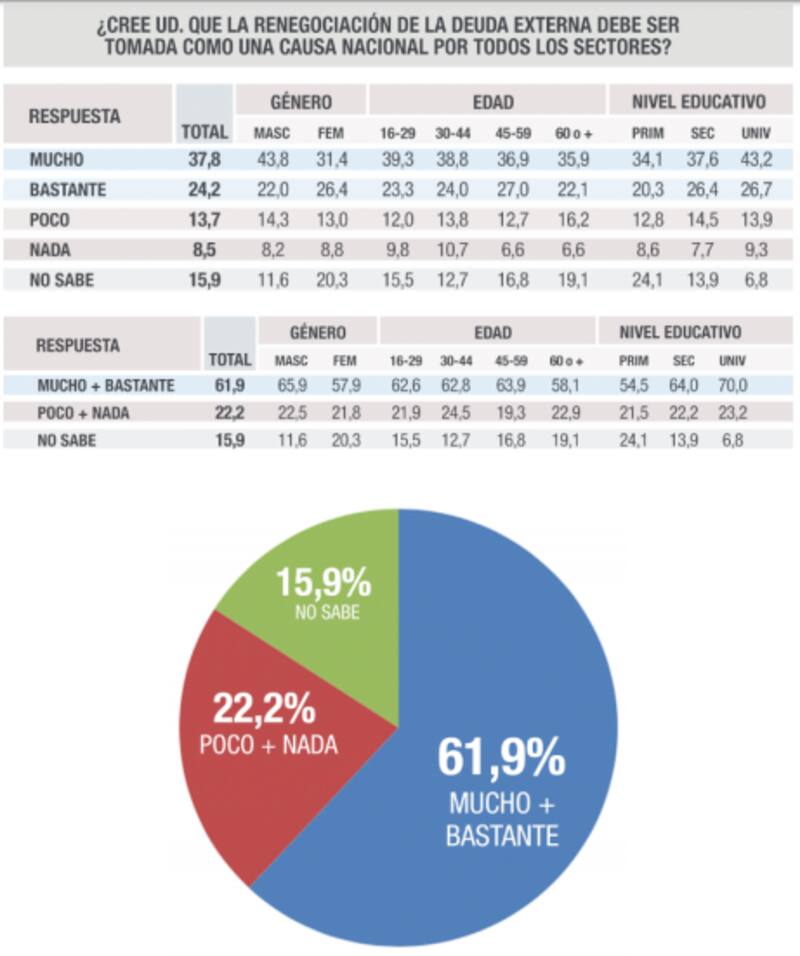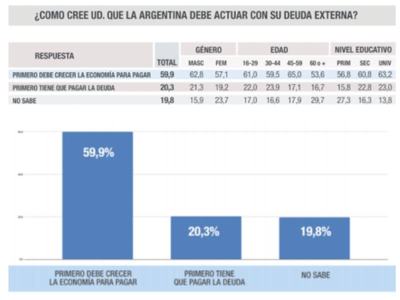 Según el relevamiento, entre el 60% y el 70% de los encuestados considera un grave problema el nivel de endeudamiento al que está expuesto la Argentina y el 61,9% estima que la renegociación con el organismo multilateral de crédito debe tomarse "como una causa nacional" con apoyo de todas las fuerzas, como quedó plasmado en la votación de la Cámara de Diputados al proyecto de ley de Sostenibilidad de la Deuda, que apenas la Izquierda rechazó.