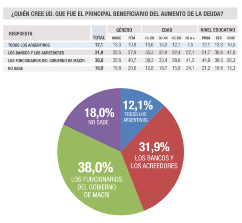 Para Analogías, una porción mayoritaria consideró que el incremento de la deuda externa "no redundó en mejores condiciones para el desarrollo" de la Argentina, sino más bien estuvo signada por intereses particulares". Las acusaciones van contra "los funcionarios del gobierno de Macri", y "los bancos y acreedores".