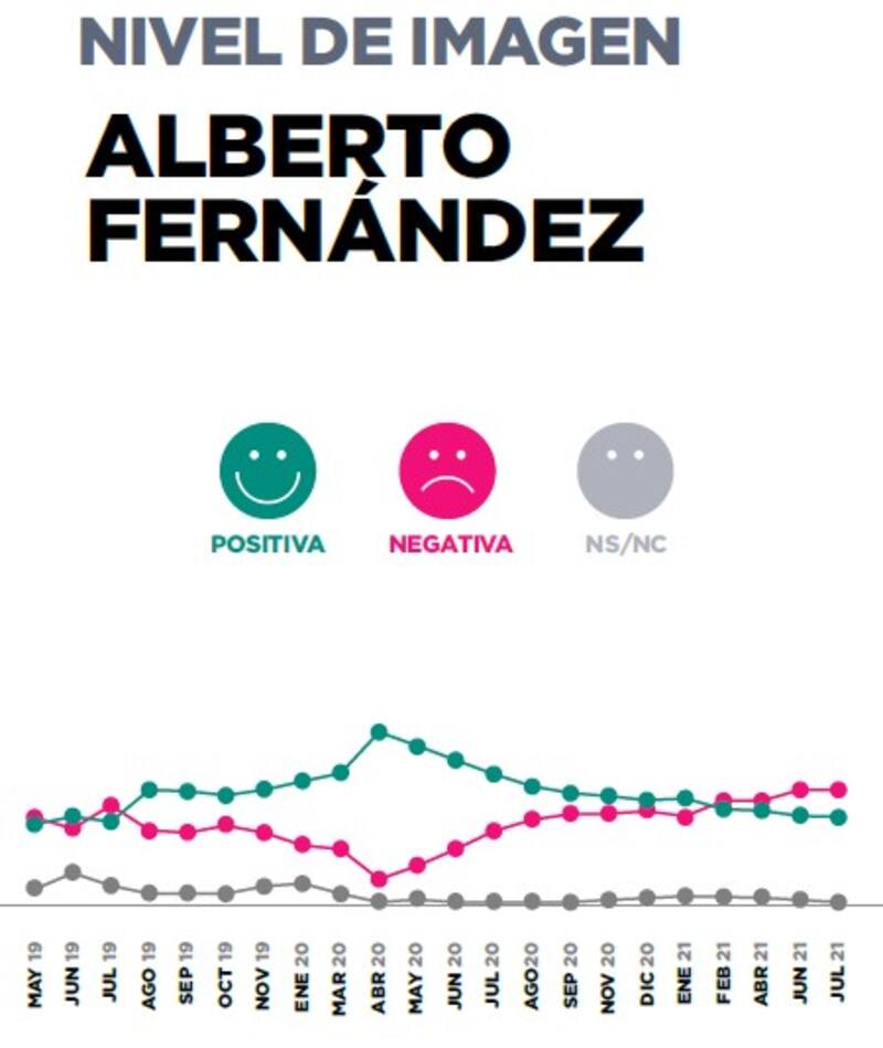 Alberto Fernández tiene una imagen negativa (56%) superior a la positiva (43%), algo similar a lo registrado el mes pasado. Los que tienen una imagen "muy buena" son el 29% y los que contestaron "buena" llegan al 14%. En cambio, el 48% dice tener una imagen "muy mala", y el 8%, "mala".