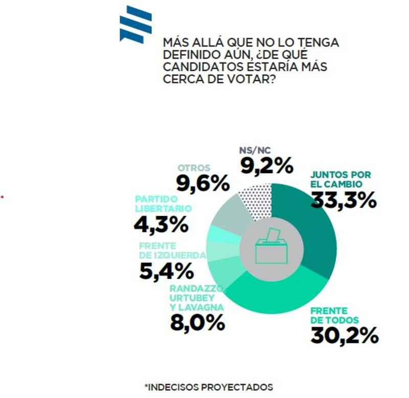 De cara a las elecciones, el relevamiento no consulta por candidatos en particular, sino por los principales frentes electorales. El 33,3% se muestra inclinado hacia Juntos por el Cambio, ante un 30,2% del Frente de Todos. Más abajo en las preferencias aparece la opción peronista vinculada a Florencio Randazzo, Juan Urtubey y Roberto Lavagna, con 8%. Luego, el Frente de Izquierda (5%) y los libertarios (4%).