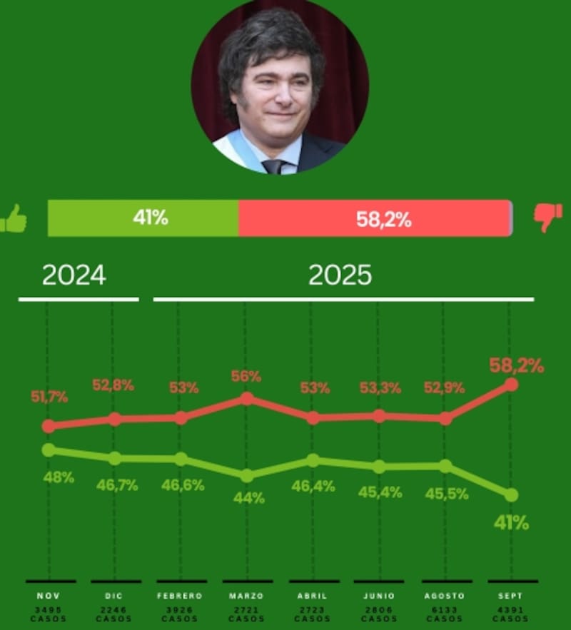 El dato alarmante para la Casa Rosada es que quienes evalúan como positiva la gestión nacional pasó del 41,7 en noviembre de 2024 a 25,3 en esta medición.