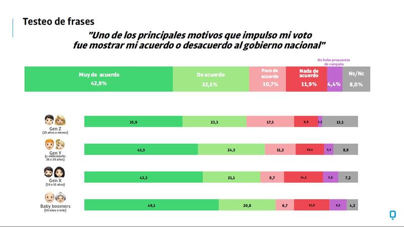 Otro de los temas que se suele plantear en las elecciones legislativas es si el voto implica un acompañamiento o rechazo a la conducción del gobierno nacional. Sobre este punto, el 65% aseguró que su elección fue en esa línea: es decir, una suerte de plebiscito al Ejecutivo nacional.