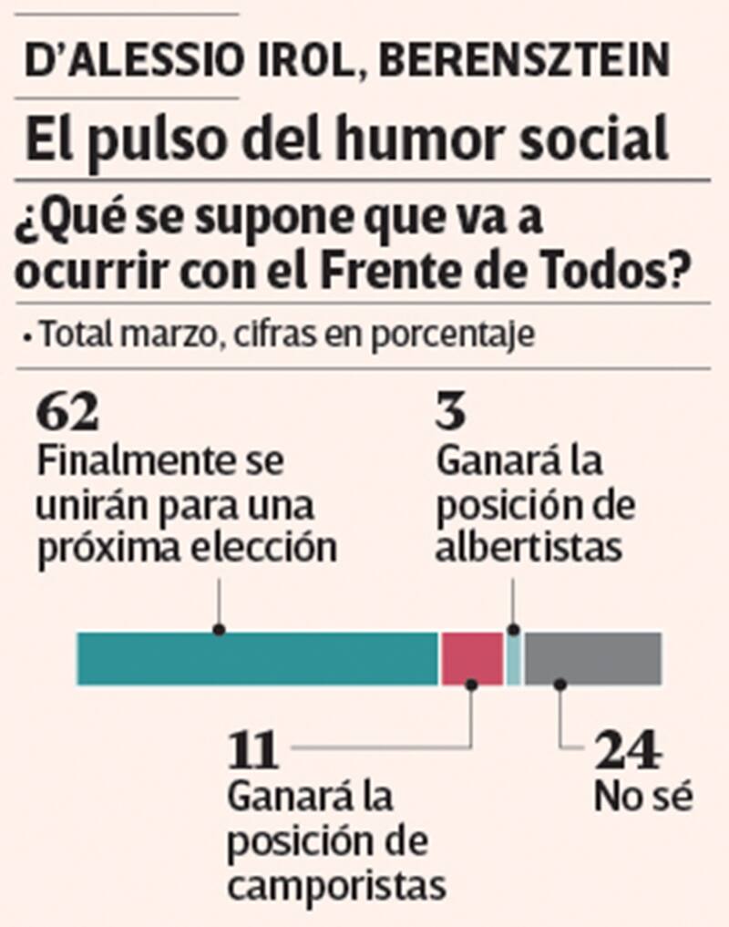 "Es interesante ver como casi dos terceras partes de la población opina que 'finalmente todos los sectores en pugna dentro de la coalición gobernante se unirán frente al riesgo de la próxima elección'. Así como también que quienes tienen menor convicción son los propios votantes del oficialismo", acotó D'Alessio. En efecto, entre quienes se inclinan por esa posibilidad aparece un 68% de los votantes de Juntos por el Cambio, 67% de los libertarios y 63% de izquierda, frente a un 54% de los electores del Frente de Todos.