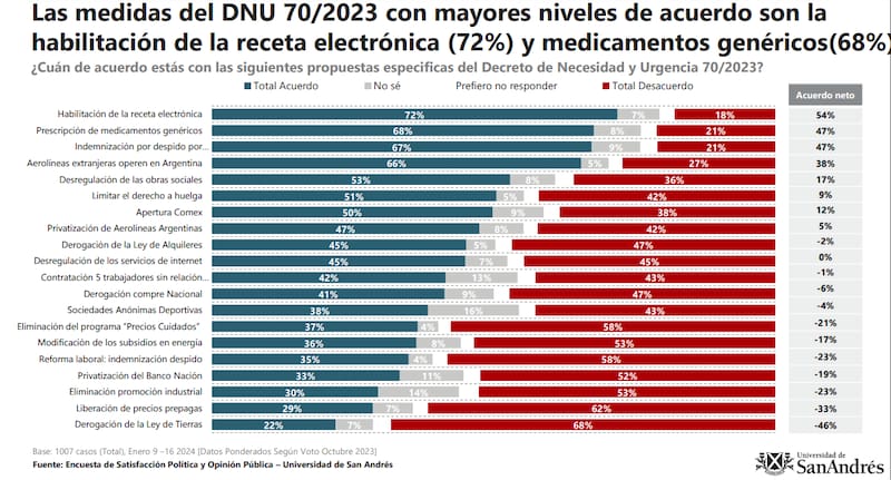 Los resultados del estudio arrojaron que un 51% de los encuestados está en desacuerdo con el DNU y el 42% está de acuerdo. También se les consultó a los participantes que opinaban sobre algunas medidas puntuales que impulsa el decreto de necesidad y urgencia.
