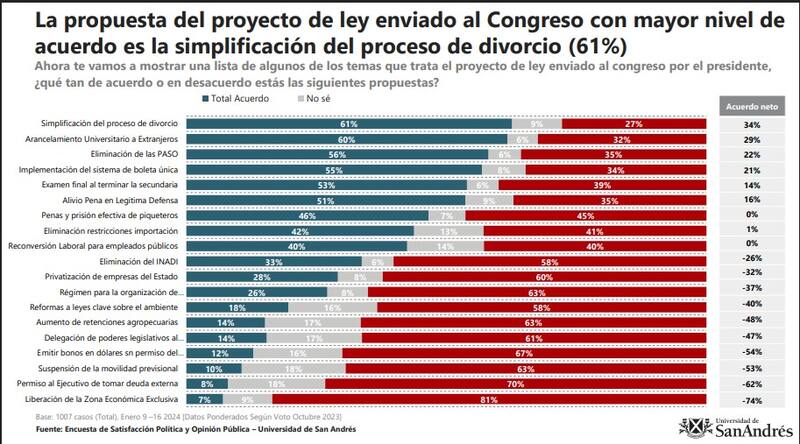 El relevamiento determinó que el 38% de los participantes está de acuerdo con el mega proyecto de ley de Javier Milei enviado al Congreso, mientras que el 41% está en desacuerdo. Entre los más de 600 artículos que modifican o derogan normas vigentes, los que recibieron el visto bueno fueron: simplificación del proceso de divorcio (61%); arancelamiento Universitario a extranjeros (60%), y eliminación de las PASO (56%) e implementación del sistema de boleta única (55%).