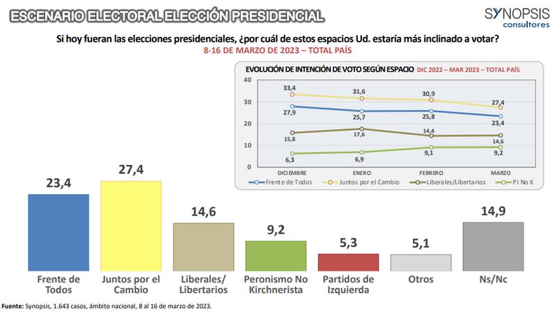 En ese contexto, Juntos por el Cambio es la coalición con mayor intención de votos. Alcanza el 27,4% hacia las elecciones presidenciales. En segundo lugar quedó el Frente de Todos con el 23,4%, seguido por Liberales (14,6%), el peronismo no kirchnerista (9,2%) y partidos de izquierda (5,3%).