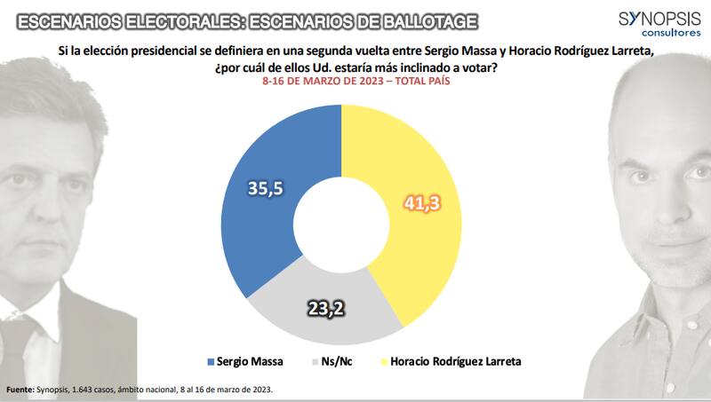 Según el trabajo de Synopsis, Rodríguez Larreta es el único candidato de la coalición que garantiza la victoria en una eventual segunda vuelta con el FDT: se impone con el 41,3% sobre Sergio Massa (35,5%).