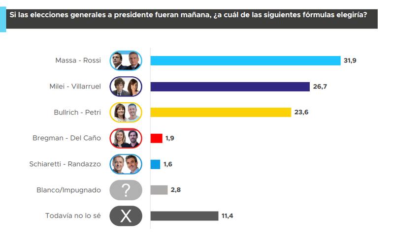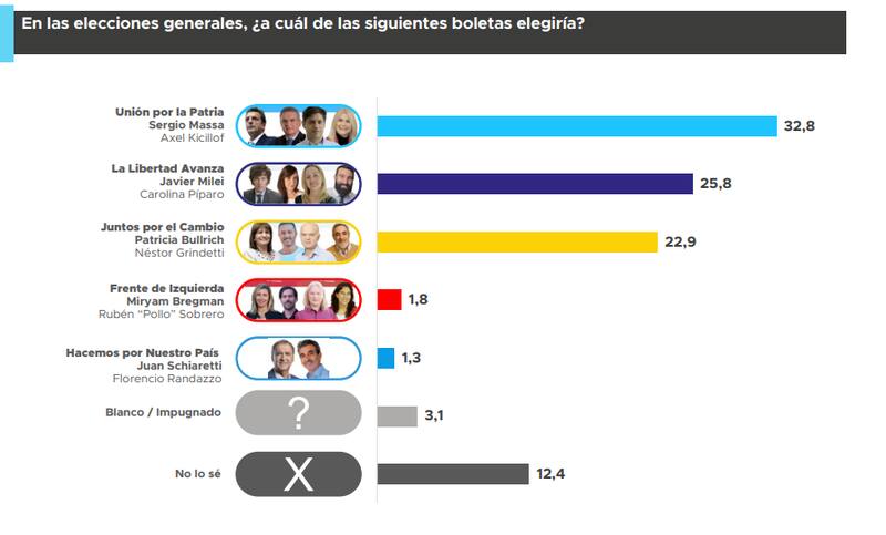 Al especificar sobre este último caso, las fórmulas de Kicillof y de Massa en conjunto quedan a siete puntos del segundo que sería la dupla de Milei y Píparo, aun con más de doce puntos por definir su voto que pueden inclinar la balanza para cualquiera de las opciones.