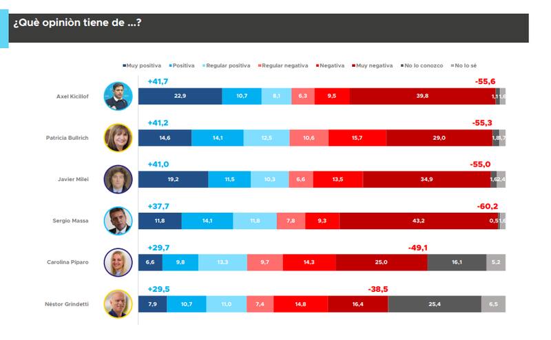 Uno de los puntos más destacados de la encuesta es la imagen, donde lidera el actual gobernador que va por la reelección, Axel Kicillof, seguido por la candidata a la Presidencia de Juntos por el Cambio, Patricia Bullrich, Javier Milei, de La Libertad Avanza.