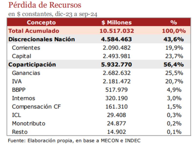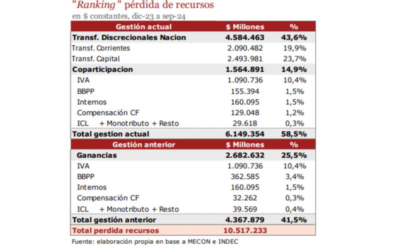 El estudio contabilizó primero por un lado los recortes en transferencias de carácter presupuestario "discrecional", que llevó a cabo el gobierno libertario, y por otro lado la drástica caída en las transferencias automáticas del Régimen de Coparticipación Federal, que corren por cuenta en gran medida de la gestión precedente.