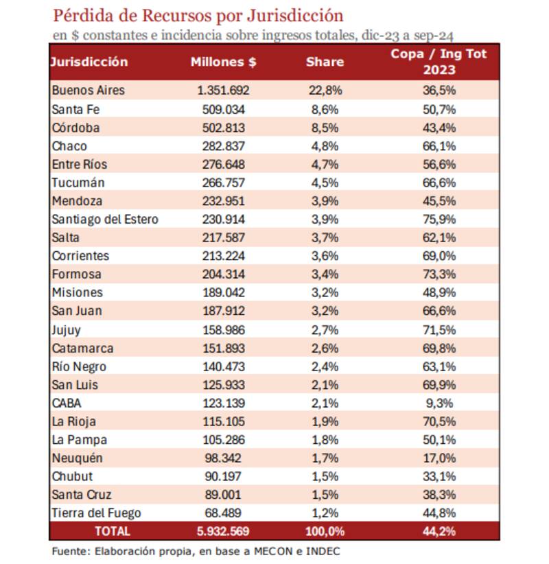 Buenos Aires, a cargo de Axel Kicillof, es la jurisdicción que más sufrió la caída en los envíos automáticos con una pérdida de $1,35 billones, seguida por Santa Fe y Córdoba (ambas con $0,5 billones), Chaco ($0,28 billones) y Entre Ríos ($0,27 billones) en valores absolutos. Si se analiza la incidencia en términos de ingresos totales, los últimos dos distritos presentan un mayor impacto en términos relativos.