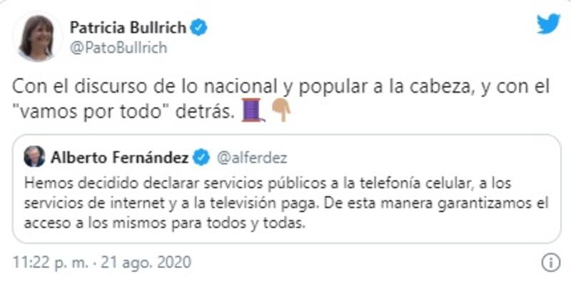 Quien llevó la voz cantante fue la de la titular del PRO, Patricia Bullrich, quien afirmó que detrás del anuncio se esconde el “vamos por todo y comparó la decisión con el “modelo venezolano . “Con el discurso de lo nacional y popular a la cabeza, y con el ‘vamos por todo’ detrás , sostuvo la ex ministra de Seguridad en su cuenta de Twitter citando uno de los mensajes del presidente Alberto Fernández .