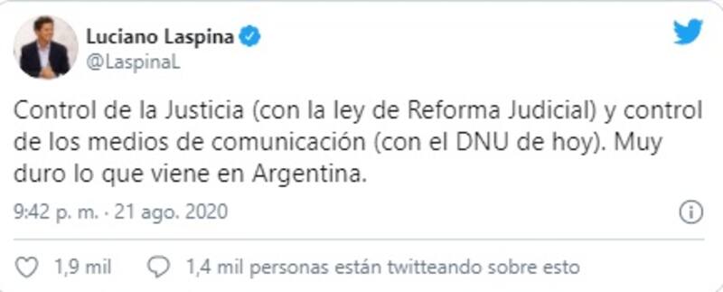 Otro de los dirigentes que criticó la decisión del Gobierno fue el diputado nacional del PRO Luciano Laspina, quien escribió en su cuenta de Twitter: “Control de la Justicia (con la ley de Reforma Judicial) y control de los medios de comunicación (con el DNU). Muy duro lo que viene en Argentina .