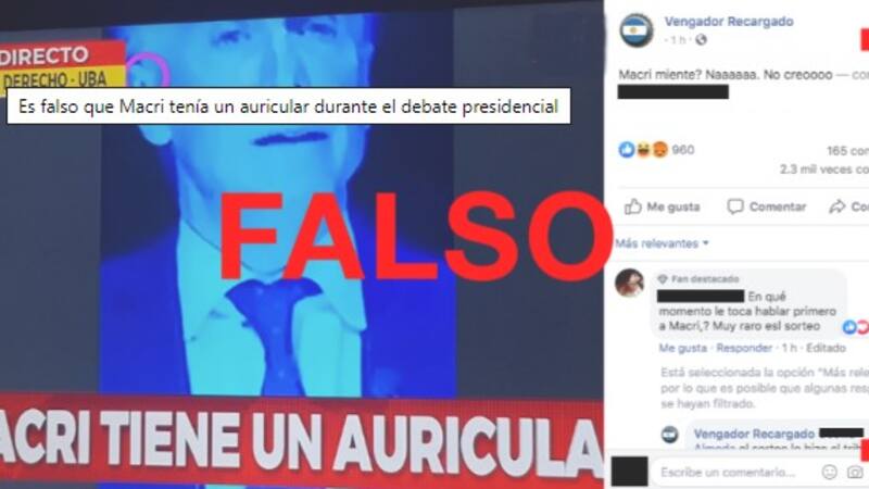 Durante el segundo debate presidencial, empezaron a circular en redes sociales distintas publicaciones que afirmaron que el presidente de la Nación y candidato a la reelección por Juntos por el Cambio, Mauricio Macri, estaba participando en el debate con un audífono o auricular en la oreja derecha (ver acá y acá). Sin embargo, esto es falso: en los registros fotográficos del debate obtenidos por Reverso, se puede comprobar que el Jefe de Estado no tuvo ningún audífono o dispositivo similar en ninguna de sus orejas (ver acá y acá).