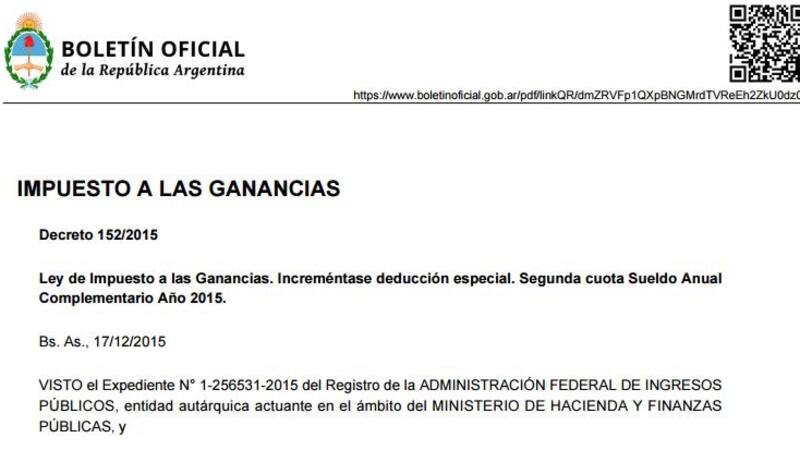 "Increméntase la deducción especial establecida en el inciso c) del Artículo 23 de dicha ley, hasta un monto equivalente al importe neto de la segunda cuota del Sueldo Anual Complementario correspondiente al año 2015", establece el artículo 1 del decreto, en referencia a la Ley de impuesto a las Ganancias.