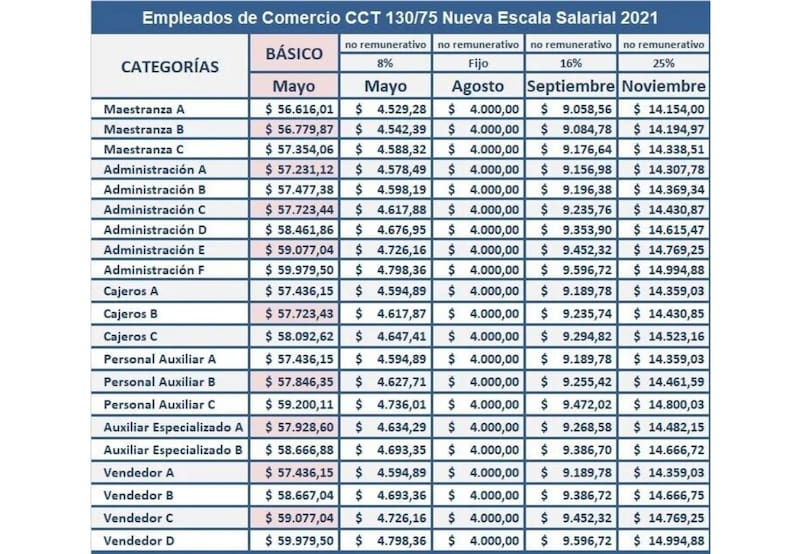 En el caso del "Personal Auxiliar A", el salario inicial será de $57.436,17; se suma un adicional no remunerativo de $ 9189,79, y en total el salario en septiembre quedaría en $ 66.625,96. El mismo monto le corresponderá a un "Vendedor", según las escalas publicadas por la Federación Argentina de Empleados de Comercio.