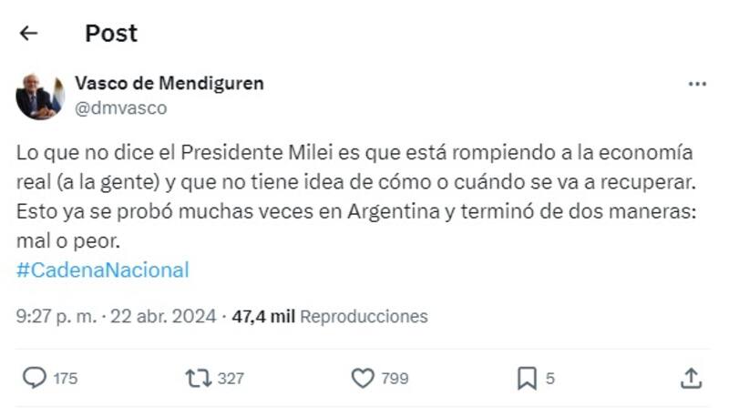 "Lo que no dice el Presidente Milei es que está rompiendo a la economía real (a la gente) y que no tiene idea de cómo o cuándo se va a recuperar. Esto ya se probó muchas veces en Argentina y terminó de dos maneras: mal o peor", explicó en su publicación.