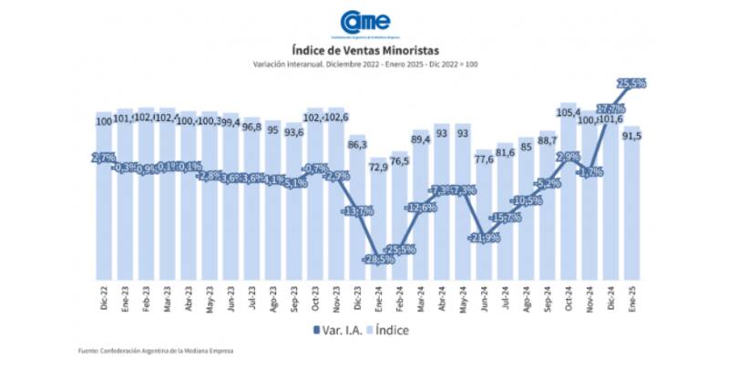 Las ventas minoristas de las pequeñas y medianas empresas (pymes) registraron un crecimiento del 25,5% interanual en enero de 2025, según el Índice de Ventas Minoristas (IVM) Pymes de la Confederación Argentina de la Mediana Empresa (CAME). Sin embargo, este incremento no logró compensar la caída histórica del 28,5% registrada en el mismo mes del año anterior. Además, en la comparación mensual desestacionalizada, las ventas cayeron un 0,5%, lo que refleja los desafíos que enfrenta el sector en un contexto de estacionalidad, baja liquidez post-fiestas y un éxodo de consumidores a países limítrofes.