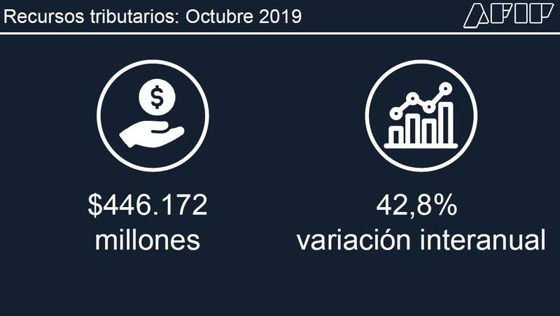 La recaudación tributaria fue de $ 446.172 millones en octubre, una suba de 42,8% interanual, informó esta tarde la Administración Federal de Ingresos Públicos (AFIP).
