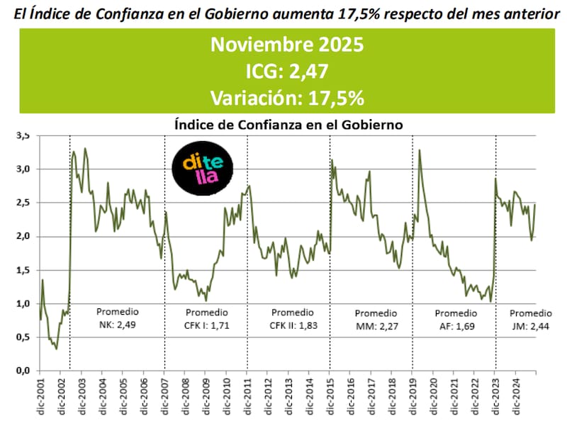 El Índice de Confianza en el Gobierno (ICG) que elabora la Universidad Torcuato Di Tella registró en noviembre un fuerte repunte y se ubicó en 2,47 puntos, lo que implica una suba mensual del 17,5%. El salto compensa las caídas observadas en agosto y septiembre, y lleva el indicador a su valor más alto desde febrero de este año, cuando había marcado 2,56 puntos.