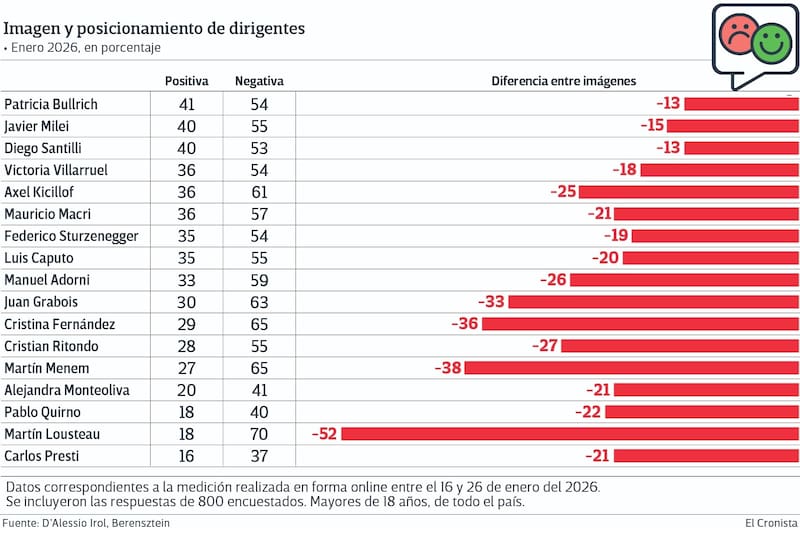 La lista de dirigentes con mejor imagen sigue siendo encabezada por los referentes del oficialismo, aunque ninguno de los relevados posee un balance positivo. La senadora Patricia Bullrich encabeza la lista de los referentes en actividad, con 41% de imagen positiva y 54% de negativa, apenas por encima del presidente Javier Milei (40% y 55%, respectivamente) y el ministro del Interior, Diego Santilli (40% y 53%).
