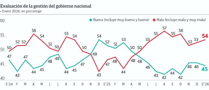 Sobre este último punto, la visión se mantiene estable en las últimas tres mediciones, con un mayoritario 61% de respuestas negativas, que coincide prácticamente con todos los votantes de Fuerza Patria pero también 23% de los votantes de la Libertad Avanza, y apenas un 34% de positivas, en el que se anotan siete de cada diez electores de LLA.