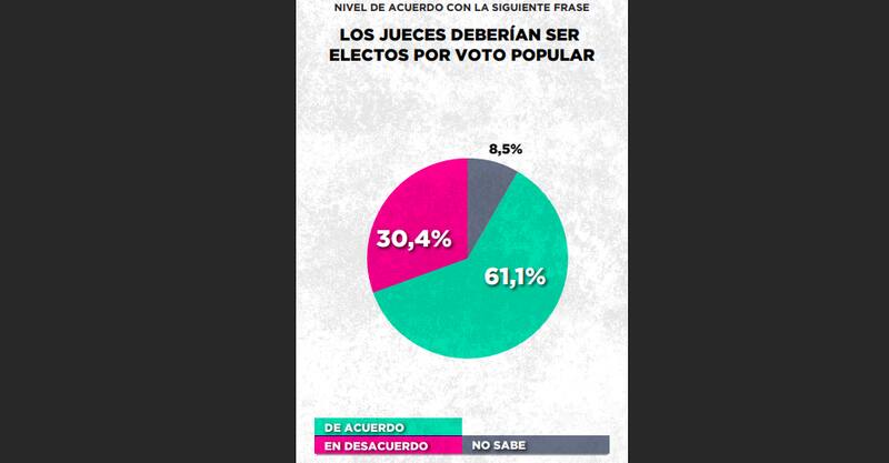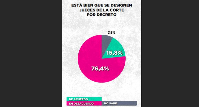 Aún más contundente, más del 75%está en desacuerdo con la designación de jueces de la corte por decreto presidencial. "La paradoja es contundente: el electorado quiere justicia, pero no le cree a los jueces; quiere condenas, pero duda de los condenadores", aseguraron.