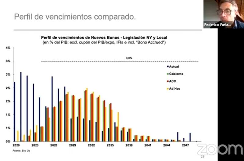 En ese sentido, explicó que las obligaciones de pago de deuda entre 2020 y 2025 entre capital e intereses requieren para la Argentina actualmente un desembolso de 2% del PBI por año y que la propuesta del Gobierno implica un despeje importante de los vencimientos, dado que hasta 2025 requerirían un esfuerzo de 0,5% del producto por año y hasta 2028 significarían un 'ahorro' de u$s 50.000 millones en pago de intereses.