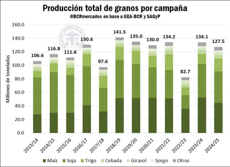La producción total de granos para la campaña 2024/25 se estimó en 127,5 millones de toneladas (Mt), un 11% menos que las 143 Mt proyectadas inicialmente y por debajo de las 134 Mt de la campaña anterior. Esta merma se debió principalmente a las condiciones climáticas, que afectaron con mayor severidad al norte argentino, región que quedó fuera del área beneficiada por las últimas lluvias.